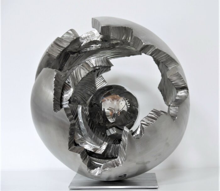A propos de l’œuvre : Oeuvre vendue en parfait état. La série Exclos, née de la rencontre des concepts d’explosion et d’éclosion, construit un univers intemporel et puissant, directement puisé de la matière brute de l’acier. L’artiste conçoit des volumes d’inox comme « une énergie en expansion canalisée par une force douce et protectrice ». Guillaume Roche recherche le contraste entre des formes brutes, arrachées et des formes minimalistes, polies. Sa recherche plastique s’appuie sur la transformation de la matière, le mouvement, l’infiniment grand et l’infiniment petit.